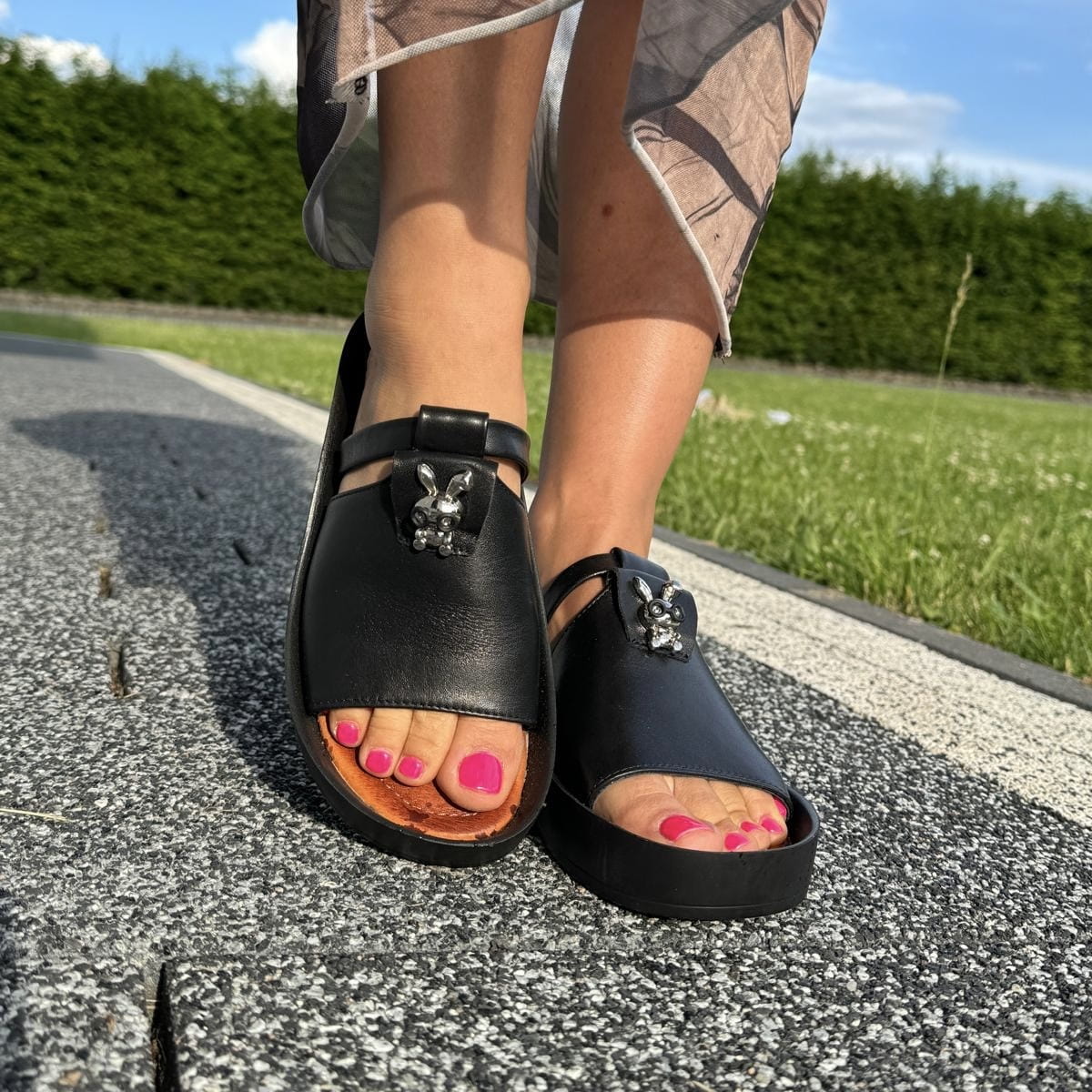 ROVIGO to wyjątkowy model klapka. Buty zostały wykonane ze skóry naturalnej. Cholewka została ozdobiona metalowym zającem. Model został położony na bardzo wygodnej i równie ciekawej podeszwie. Model z pewnością przyciągnie uwagę nie jednej osoby.