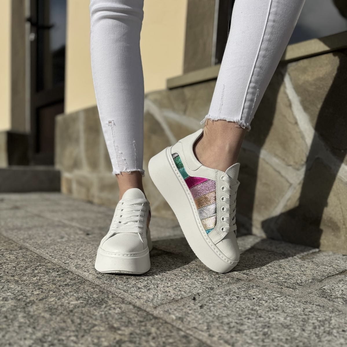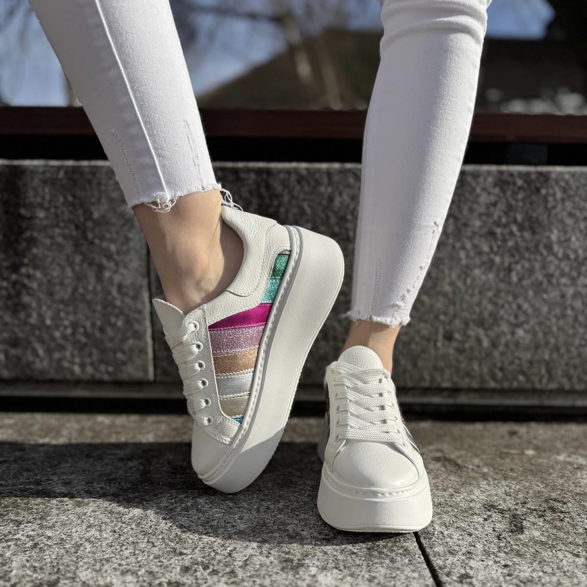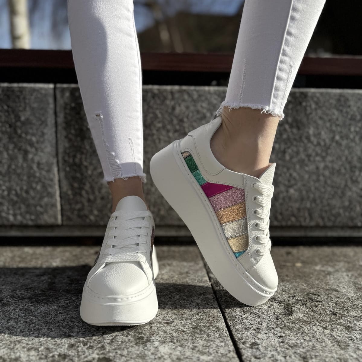 Cudowny model na podwyższonej podeszwie Teora. Wyjątkowy wygląd zawdzięcza zastosowanej bardzo modnej podeszwie oraz ciekawej cholewce. Do ozdobienia butów zostały wykorzystane połączone ze sobą różnokolorowe paski. Całość wygląda cudownie.
