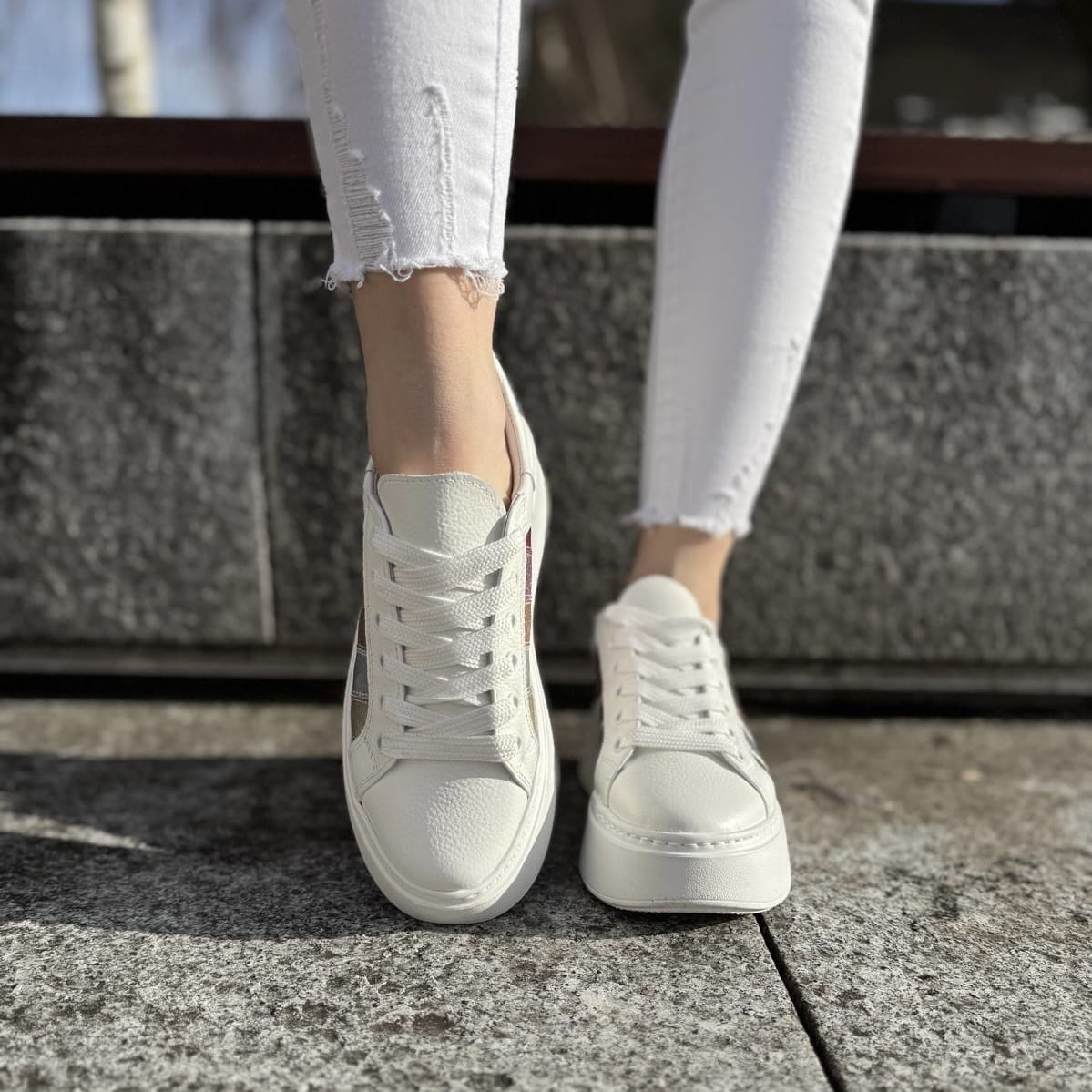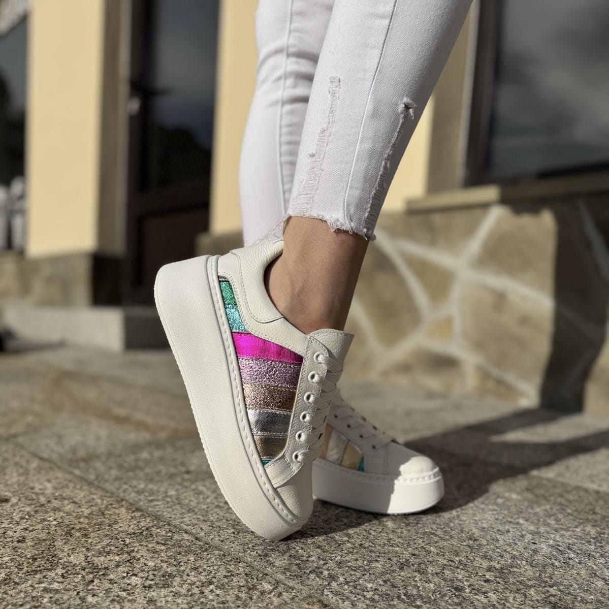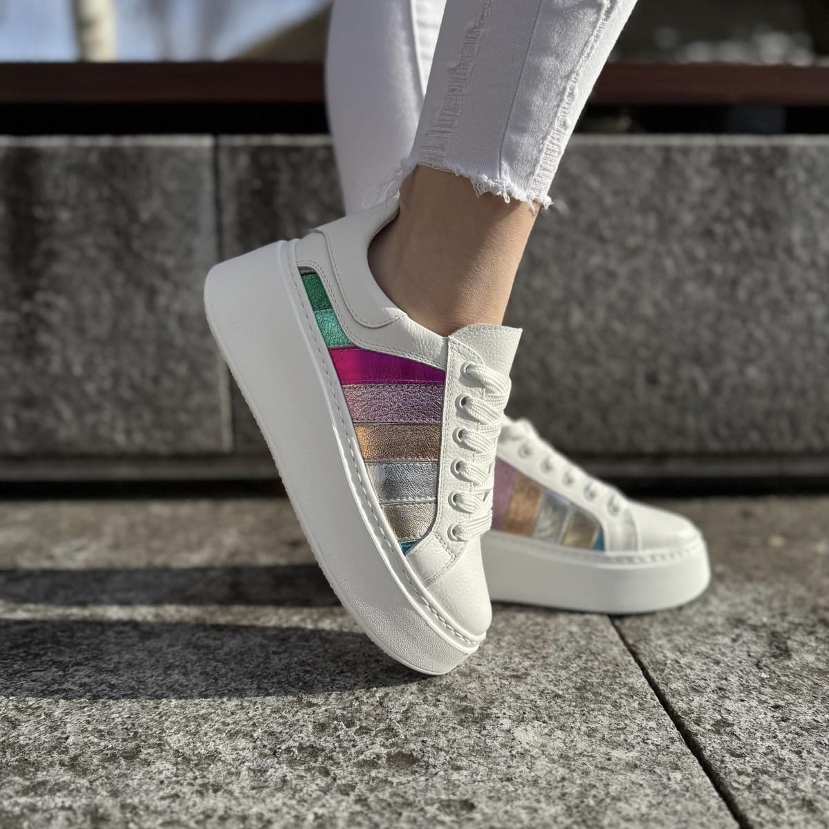 Cudowny model na podwyższonej podeszwie Teora. Wyjątkowy wygląd zawdzięcza zastosowanej bardzo modnej podeszwie oraz ciekawej cholewce. Do ozdobienia butów zostały wykorzystane połączone ze sobą różnokolorowe paski. Całość wygląda cudownie.