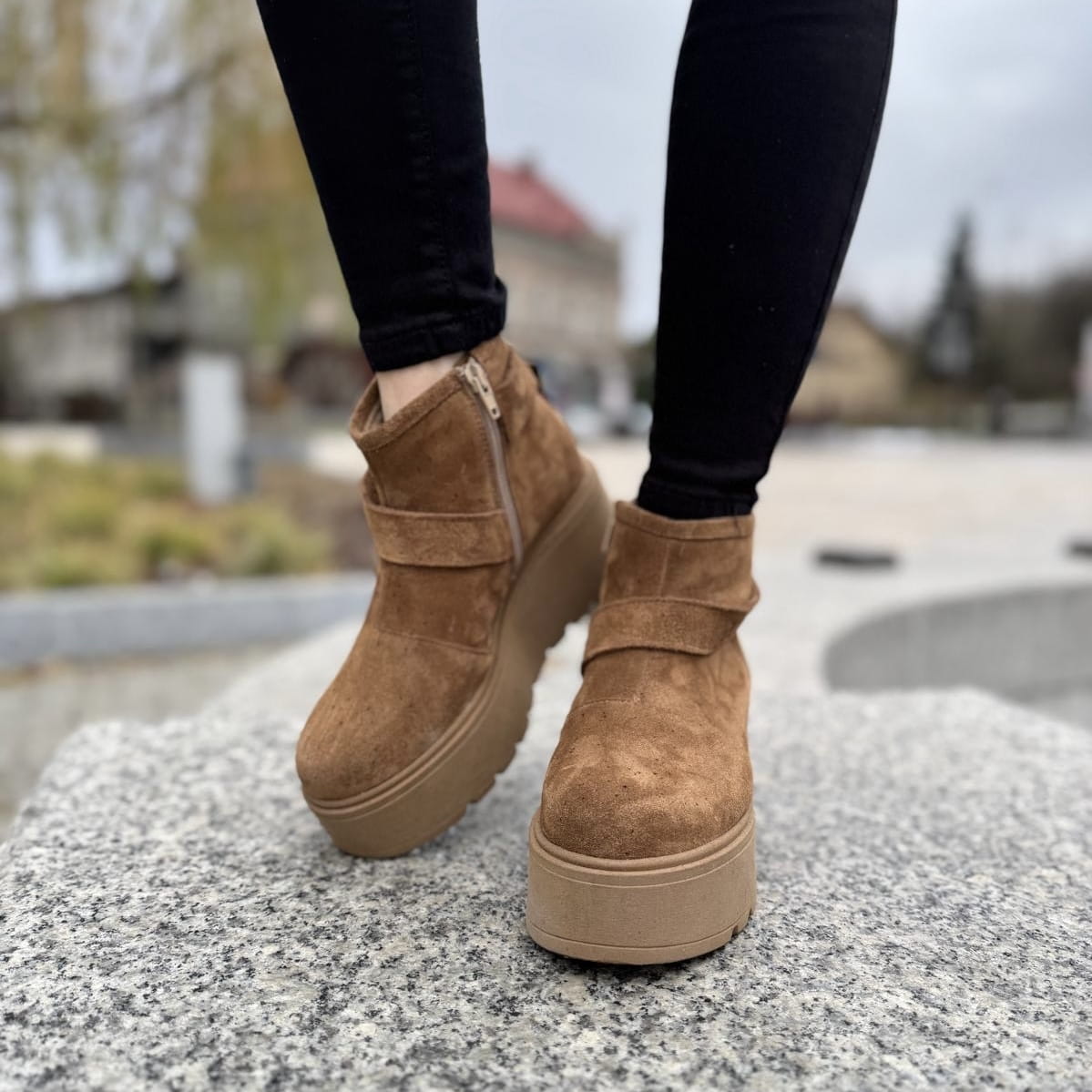 Rude Botki Damskie z ozdobnym paskiem na platformie ILLASI COGNAC