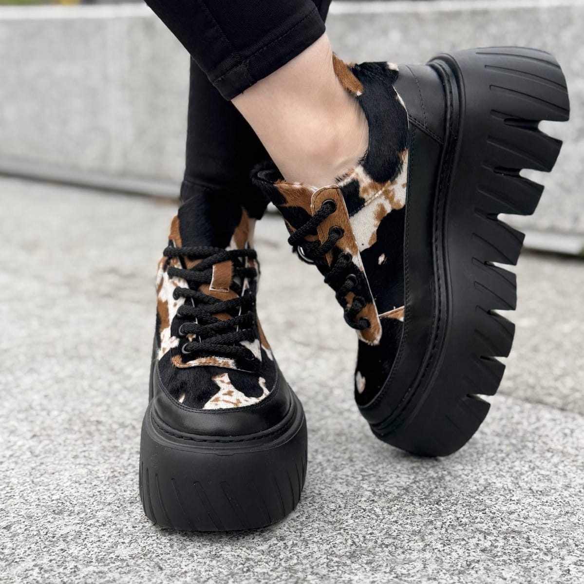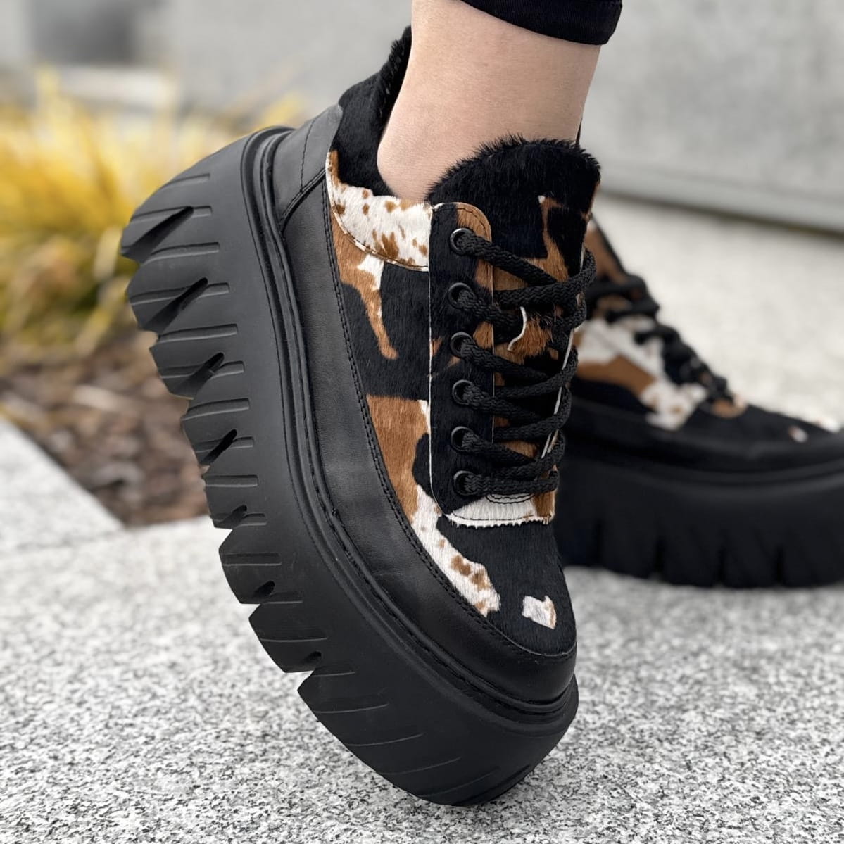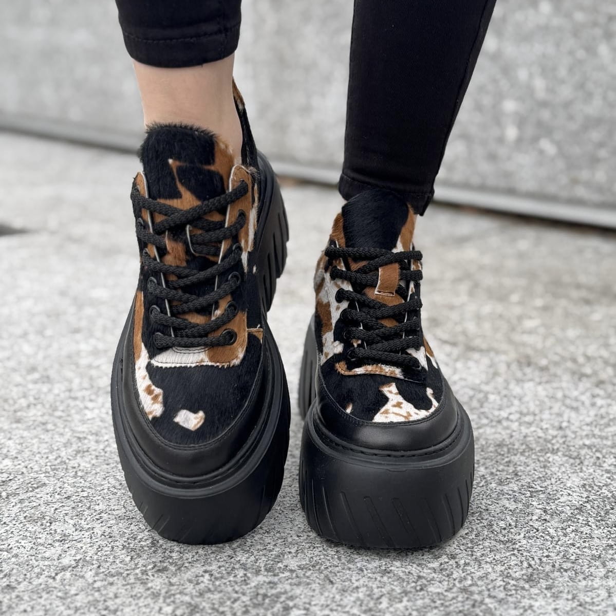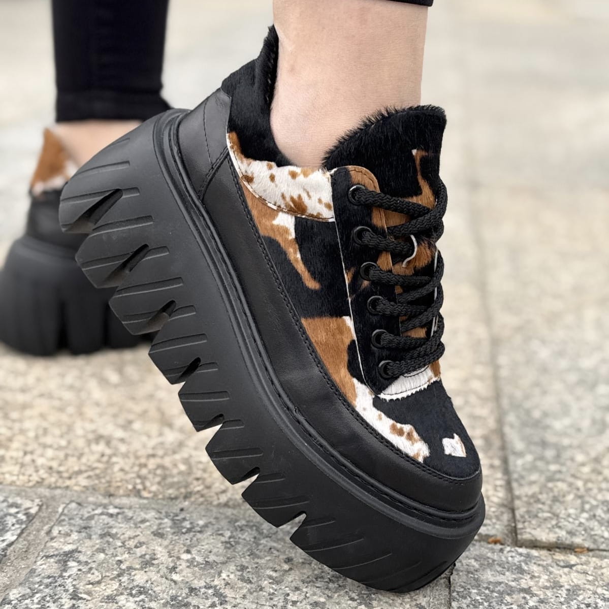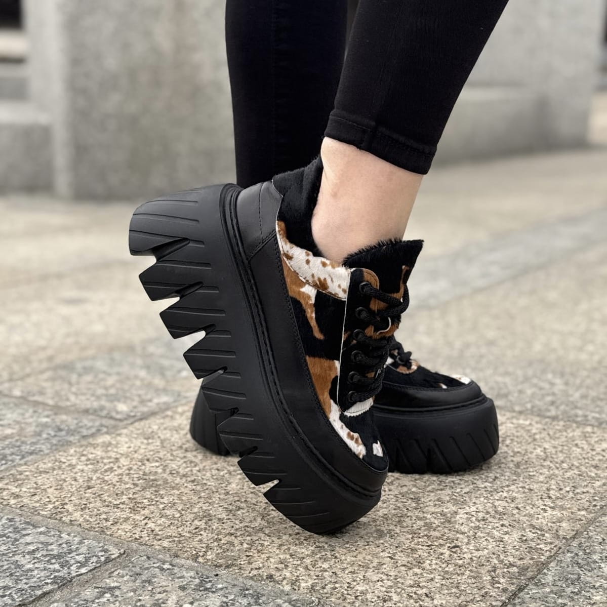 Cudowny model na podwyższonej podeszwie Riposto. Wyjątkowy wygląd zawdzięcza zastosowanej bardzo modnej podeszwie oraz ciekawej cholewce. Model został wykonany ze skóry w piękne łaty, ze skóry z włosem naturalnym. Całość tworzy niepowtarzalny i wyjątkowy wygląd.