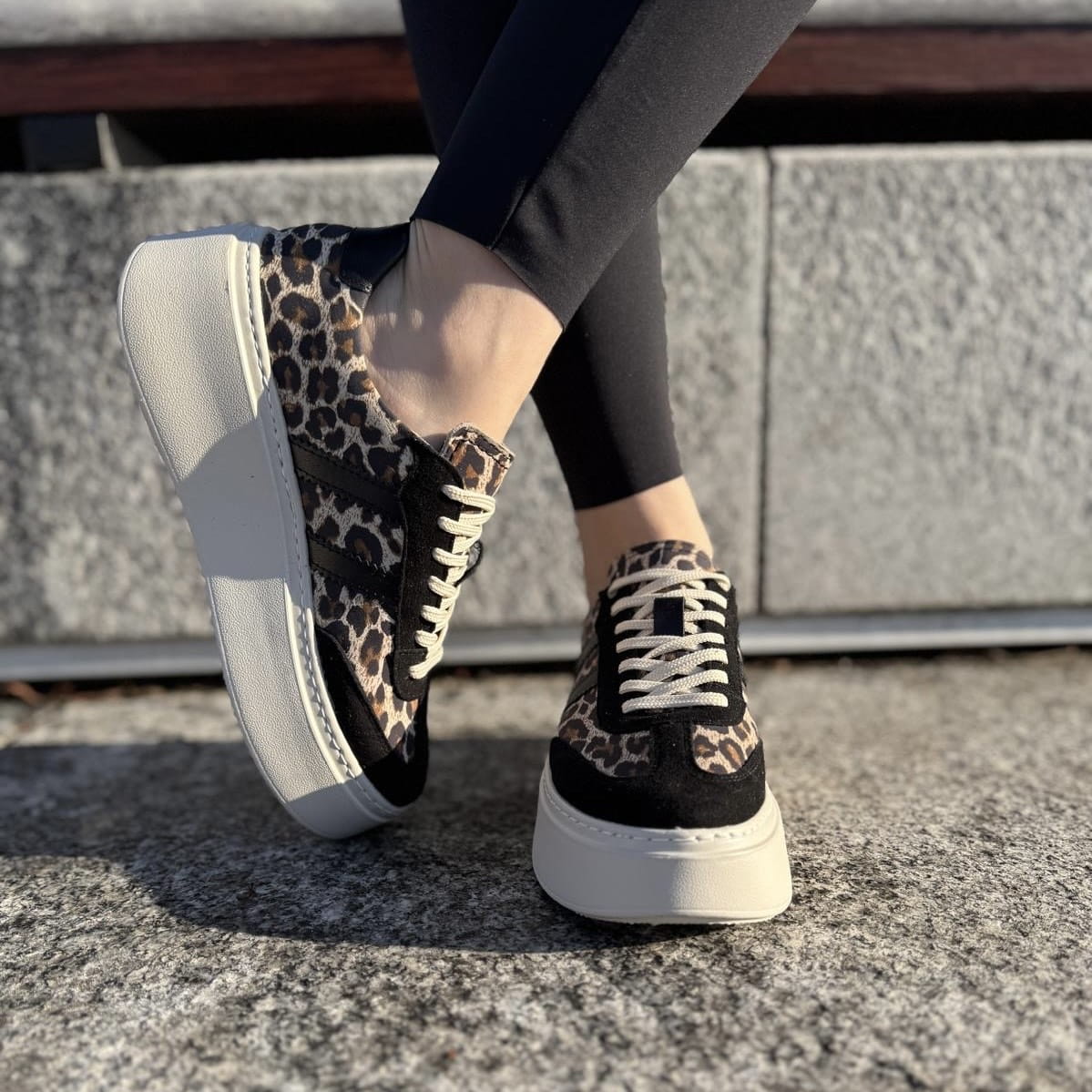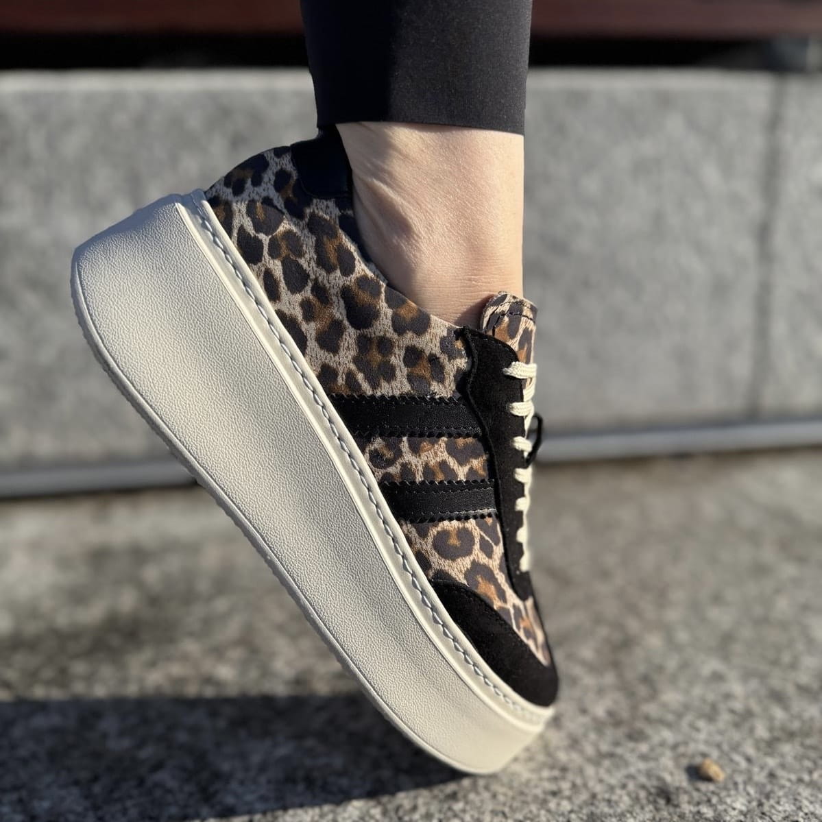Sneakersy Damskie w panterkę na podwyższonej podeszwie FERLA BEIGE/BLACK skóra naturalna