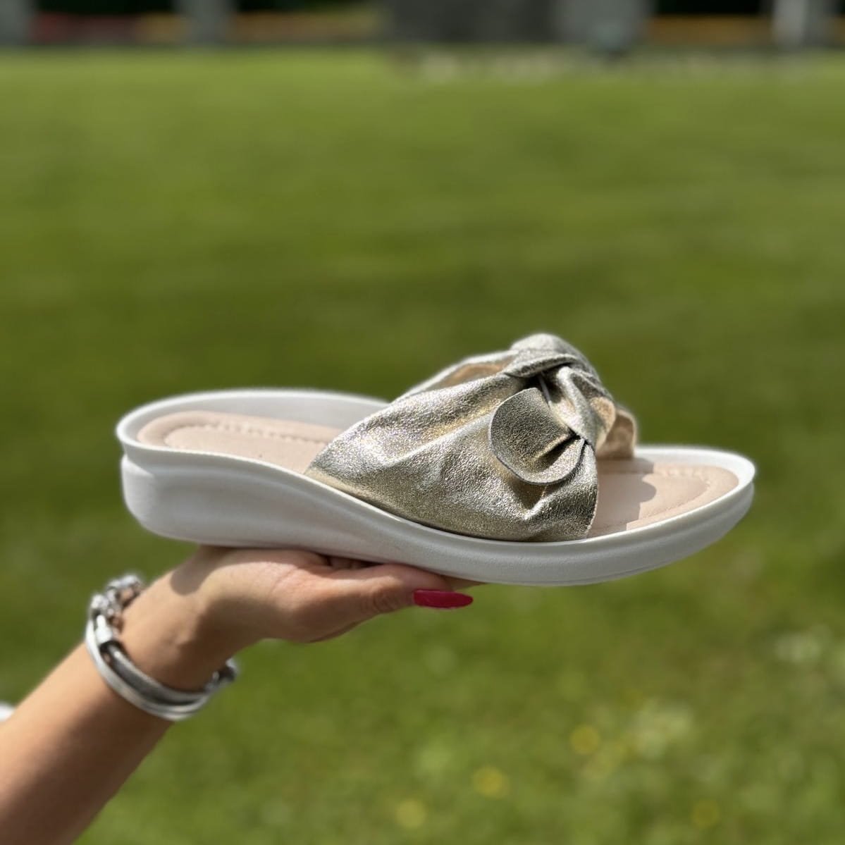 Złote Klapki Damskie na niskiej koturnie model AVELLA GOLD skóra naturalna